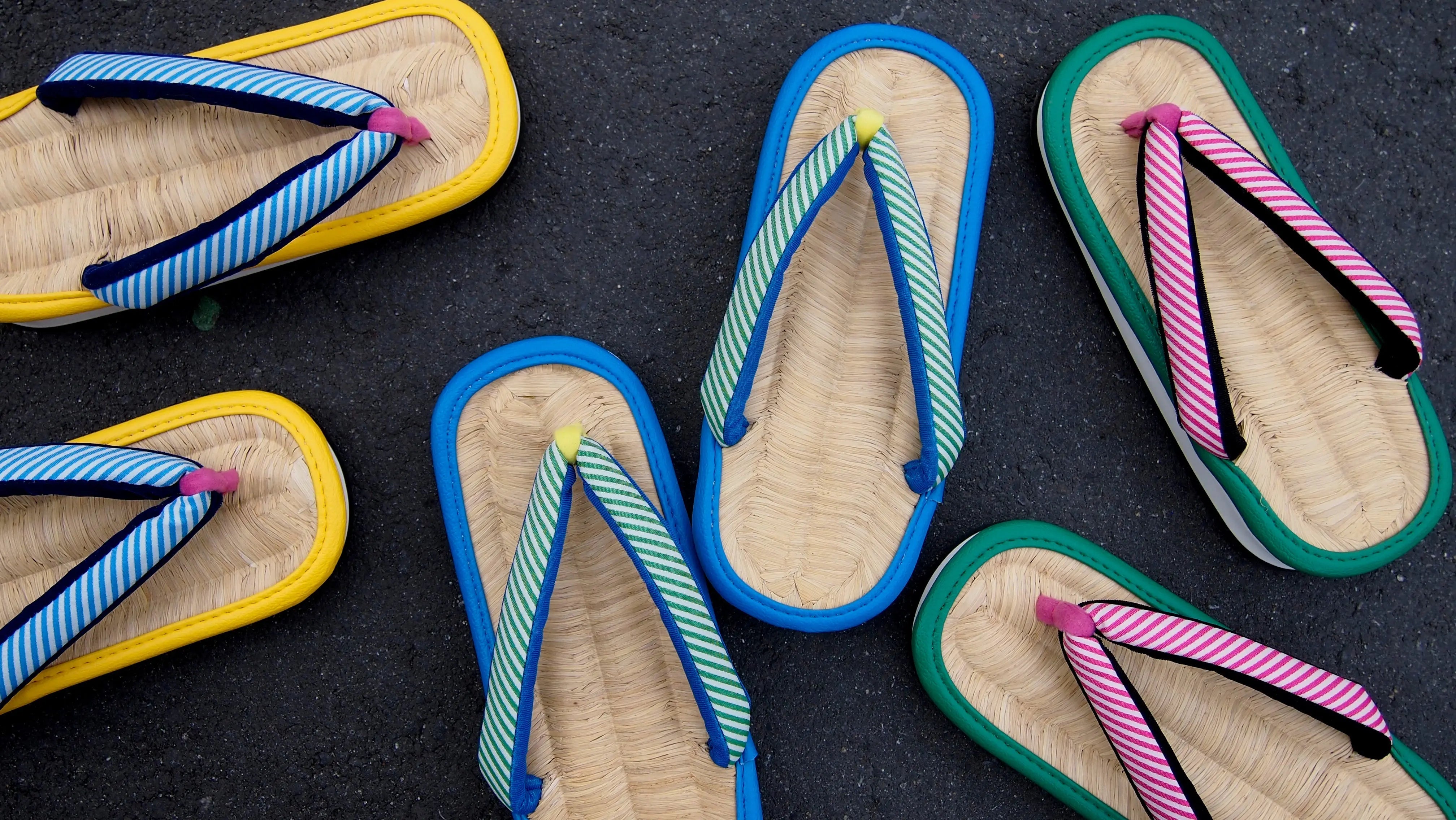 昔ながらの草履には「左右」がありませんが、初めての方でも履きやすくするために、鼻緒の位置を右と左でずらしてあります。