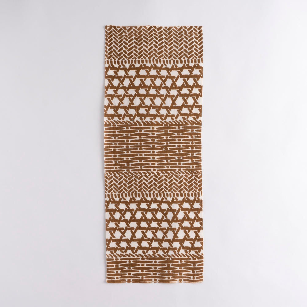 籠目(かごめ)文様を組み合わせた和の意匠が、空間や装いに落ち着きと温もりをもたらす一枚。