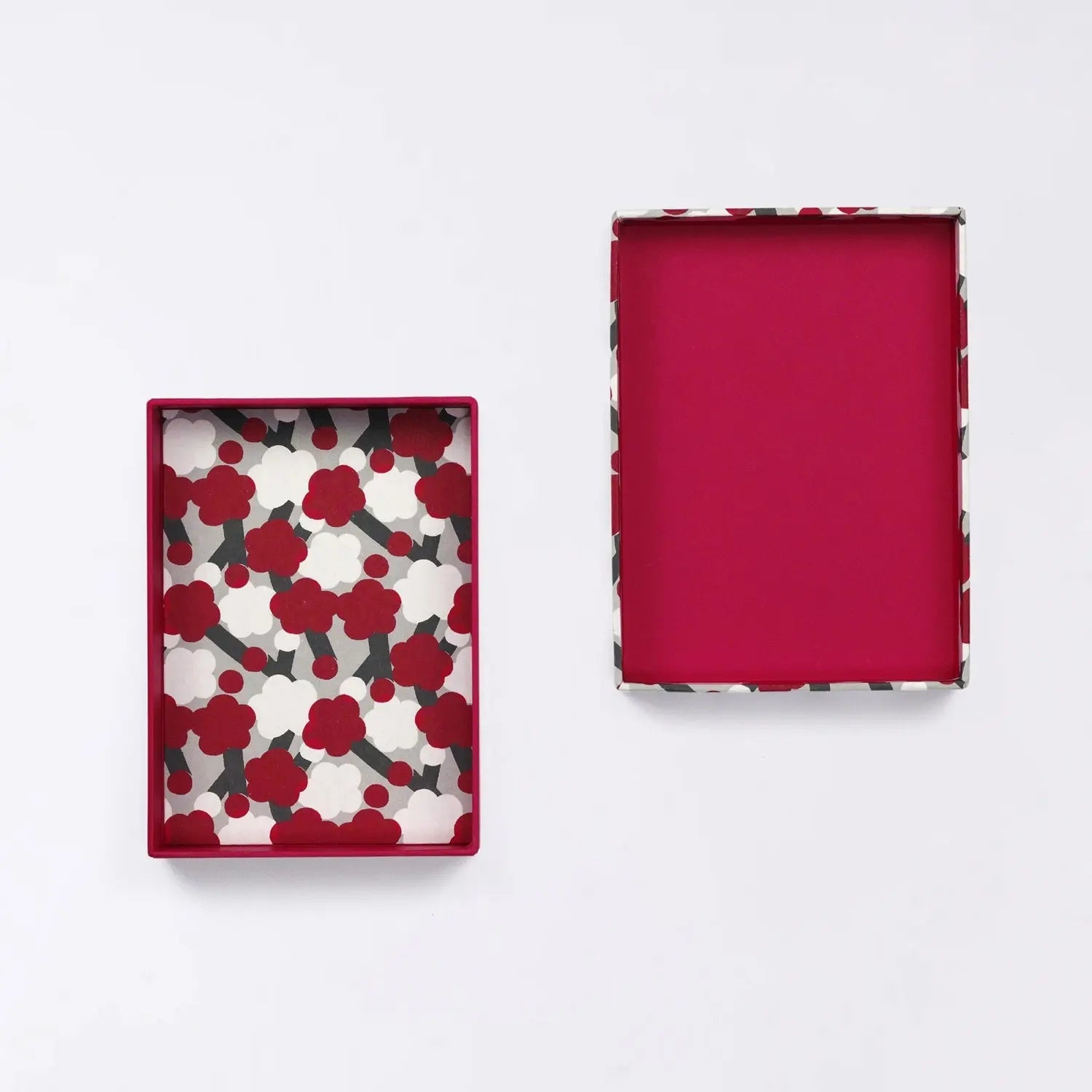 開いたときの美しさにもこだわり、内側底面にも梅文様の手染め和紙を使用。表の文様とのバランスを考えた配色が洗練された印象を与えます。
