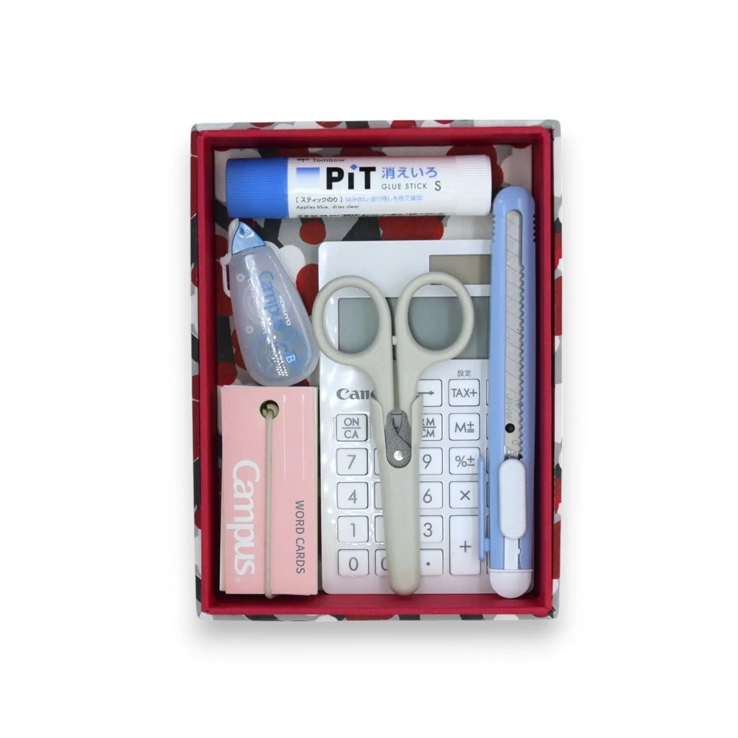 貼り箱ケースは、ハサミや計算機、のり、カッターなど、さまざまな文房具が収まるちょうどよいサイズ感。